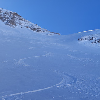 Η κατάβαση από την Μεγάλη Χράπα ξεκινάει με μια μεγάλη τραβέρσα προς την κορυφή της Κακαρδίτσας με σκοπό να αποφύγουμε τα απόκρυμνα περάσματα και γκρέμια κάτω από το διάσελο της κορυφής και με στόχο να κατεβούμε το μεγάλο κεντρικό λούκι που φαινόταν να μας περιμένει με εξαιρετική φρέσκια και απάτητη πούδρα!